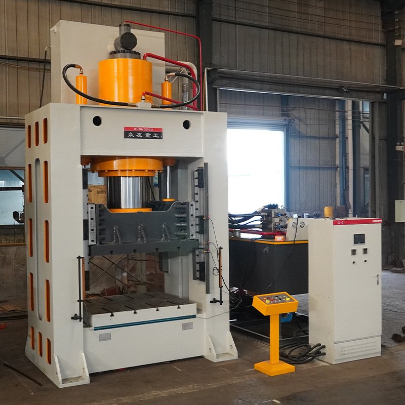 The main body of the frame hydraulic press consists of an integral welded frame (or combined frame), usually consisting of an upper crossbeam, lower crossbeam and multiple pillars in the center (or the integral frame) connected by high-strength bolts or welding to form an extremely rigid closed frame. Compared with the traditional “three beams and four columns” structure, its advantages are: