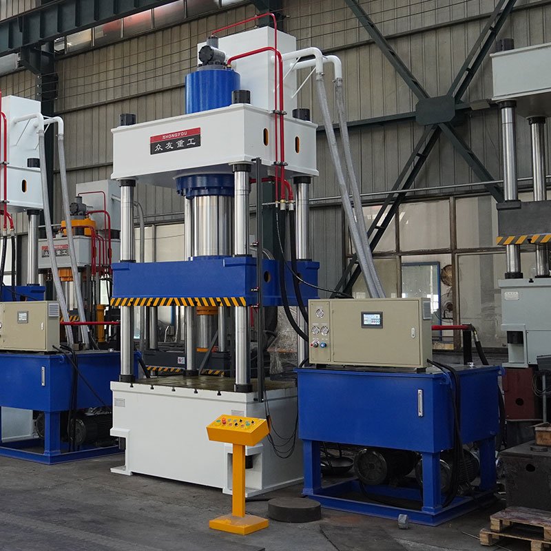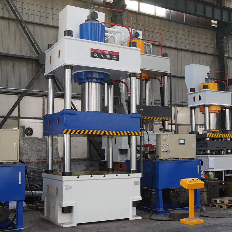 Stainless steel water tank hydraulic presses utilize the principle of hydrostatic pressure to forge stainless steel plates into the desired shape for manufacturing tank panels. This equipment typically employs a three-beam, four-column structural design, where the machine body consists of an upper beam, a movable beam, and a lower beam connected by four vertical columns. These components are secured with nuts to form a closed, rigid frame capable of withstanding the forces exerted during hydraulic press operation.